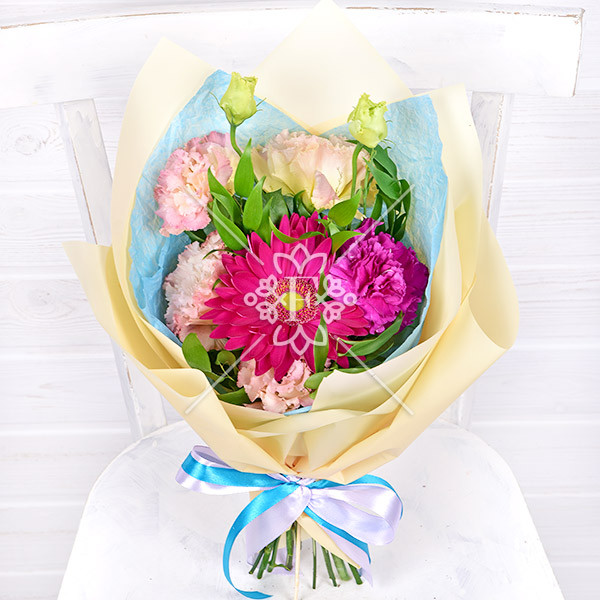Приятный комплимент – букет из эустомы, герберы и гвоздики